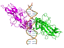 NF-κB (green) heterodimerizes with RelB (cyan) to form a ternary complex with DNA (orange) that promotes gene transcription.[25]