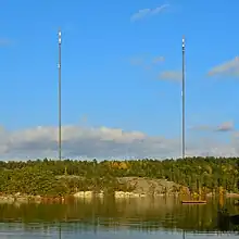 Nackasändaren is a facility for FM and TV-transmission at Nacka in Metropolitan Stockholm. It used from 1956 to 1983 two 160-metre-high (520 ft) guyed masts, which were designed as mast radiators for mediumwave transmission and therefore insulated against ground. In 1965 a further mast, a 299-metre-tall (981 ft) guyed steel lattice mast for FM and TV-transmissions was built. This mast is in opposite to the lower masts grounded, but carried in its upper guys insulators in order not to disturb the radiation pattern of the mediumwave transmitter. After termination of the AM transmissions, which occurred until 1978 on 773 kHz and after 1978 on 774 kHz on June 1, 1981, the old masts were demolished on November 2, 1983, and December 7, 1983. At their location a second 299-metre-tall (981 ft) steel framework mast for FM- and TV-transmission was built in 1984. After cancellation of the mediumwave transmission, the insulators of the guys of the older 299 metres tall mast were obsolete and removed.