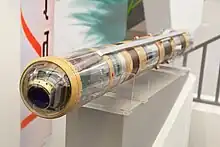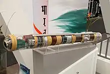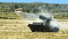 The Nag missile (IAST: Nāga - 'Cobra'), also called "Prospina" for the land-attack version, is an Indian third-generation, all-weather, fire-and-forget, lock-on after launch, anti-tank guided missile (ATGM) with an operational range of 500 m to 20 km depending on variant. It has a single-shot hit probability of 90%[9] and a ten-year, maintenance-free shelf life.[10] The Nag has five variants under development: a land version, for a mast-mounted system; the helicopter-launched Nag (HELINA) also known as Dhruvastra; a "man-portable" version (MPATGM); an air-launched version which will replace the current imaging infra-red (IIR) to millimetric-wave (mmW) active radar homing seeker;[11] and the Nag Missile Carrier (NAMICA) "tank buster", which is a modified BMP-2 infantry fighting vehicle (IFV) produced under license in India by Ordnance Factory Medak (OFMK).[12][13][14]