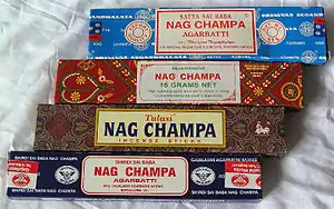Nag champa is commonly used in incense, soap, perfume oil, essential oils, candles, wax melts, and personal toiletries.[5] It is a popular and recognizable incense fragrance.[6][4]