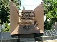The memorial to the victims of Babi Yar, in the shape of three connected stone arches with the name "Babi Yar" spelled out in Hebrew letters (Hebrew: באבי יאר), also commemorates the decimated Jewish communities of Bobruisk, Kovno, and Kiev with small brass plaques at the base of each arch.[19] The memorial was erected over bone fragments from Babi Yar that were reinterred at the cemetery. The bones were brought out of Ukraine by three American college students in July 1971. The memorial was dedicated in 1972 by Israeli Prime Minister Golda Meir.[20] The memorial is the site of an annual memorial ceremony on Yom HaShoah.[21]