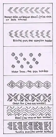 Most nakshi kanthas have some kind of border. Either a sari border is stitched on or a border pattern is embroidered around the kantha. The common border found in kanthas are as follows:[22]