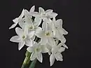 The inflorescence is scapose, the single stem or scape bearing either a solitary flower or forming an umbel with up to 20 blooms.[6] Species bearing a solitary flower include section Bulbocodium and most of section Pseudonarcissus. Umbellate species have a fleshy racemose inflorescence (unbranched, with short floral stalks) with 2 to 15 or 20 flowers, such as N. papyraceus (see illustration, left) and N. tazetta (see Table I).[11][12] The flower arrangement on the inflorescence may be either with (pedicellate) or without (sessile) floral stalks.
