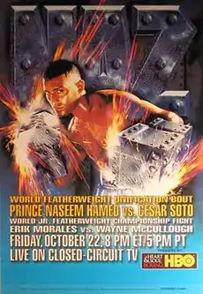 In August 1999, it was announced that WBO and lineal featherweight champion Naseem Hamed and WBC featherweight champion César Soto would fight in a unification bout on October 22 of that year.[1] Hamed was making his 13th defense of his title, while Soto was making his first, having defeated Luisito Espinosa for the tile earlier in the year on May 15. Prior to agreeing to face Soto, Hamed had himself originally hoped to face Espinosa, who prior to losing to Soto, had reigned as WBC featherweight champion for over three years. However, Hamed claimed that he had offered to fight Espinosa five separate times, but that he "kept refusing” and was "afraid" to fight him.[2]