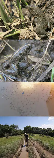 This frog breeds in the rainy season. At this time, males call and both sexes aggregate at ponds, streams, marshes, puddles, water accumulated in wheel ruts, pools and other wet locations. The eggs float and a clutch of several hundred form a raft on the surface and hatch about four days later. The tadpoles take about four to five weeks to develop to metamorphosis.[2]