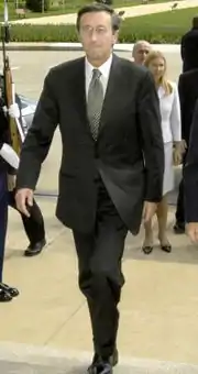 Distinguishing itself from the MSI, the party distanced itself from Benito Mussolini and fascism, and made efforts to improve relations with Jewish groups.[7] For example, after far-right skinheads celebrated the then-AN politician Gianni Alemanno's election as Mayor of Rome in 2008 by making the Roman salute outside the Palazzo Senatorio, Alemanno visited Rome Synagogue, where he gave a speech praising what he called the universal values of the fight against Nazism. The shift was also present in the rhetoric of the party's leader Fini, who went from declaring himself as "fascist for the 2000s" in 1987 when at the head of the MSI, to describing himself as a conservative at the time of the AN's launch in 1994.[20] With most hardliners leaving the party,[7][13] it sought to present itself as a respectable conservative party and to join forces with Forza Italia in the European People's Party and eventually in a united party of the centre-right. Historian David Broder has compared the AN to the People's Party in Spain, a post-Francisco Franco party.[20]
