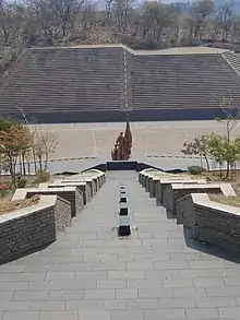 National Heroes Acre or simply Heroes Acre is a burial ground and national monument in Harare, Zimbabwe. The 23-hectare (57-acre) site is situated on a ridge seven kilometres from Harare, towards Norton. Its stated purpose is to commemorate Patriotic Front guerrillas killed during the Rhodesian Bush War, and contemporary Zimbabweans whose dedication or commitment to their country justify their interment at the shrine. Persons buried here are considered heroes by the incumbent Zimbabwe African National Union – Patriotic Front regime, which has administered the country since independence at 1980.[1] Indeed, most of the recipients of the 'hero status' were known to be Zanu-PF sympathisers.[2]