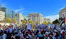 The 2023 Israel–Hamas war has sparked numerous protests, demonstrations, and vigils across the world. The protests have focused on a variety of issues related to the conflict and have been held on varying scales since the October 7 Hamas attacks.[1] The march in DC was one of many held on November 4 in support of Palestine and a cease-fire with demonstrations being held across the United Kingdom, Europe and Latin America.[2]