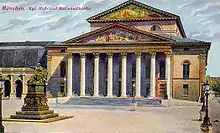 The first theatre was commissioned in 1810 by King Maximilian I of Bavaria because the nearby Cuvilliés Theatre had too little space. It was designed by Karl von Fischer, with the 1782 Odéon in Paris as architectural precedent.[1] Construction began on 26 October 1811 but was interrupted in 1813 by financing problems.[2] In 1817 a fire occurred in the unfinished building.