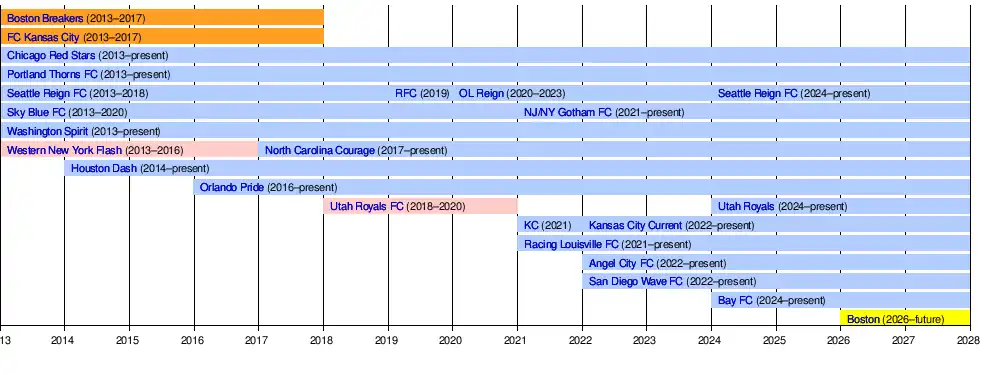 The NWSL was established in 2012 as the successor to Women's Professional Soccer (WPS; 2007–2012), which was itself the successor to Women's United Soccer Association (2001–2003). The league began play in 2013 with eight teams, four of which were former members of WPS (Boston Breakers, Chicago Red Stars, Sky Blue FC, and Western New York Flash).[3][4][5] As of 2024, there will be 14 teams across the United States.[6][7]