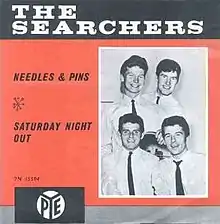 The Searchers heard British performer Cliff Bennett perform "Needles and Pins" at the Star-Club in Hamburg, Germany, instantly wanted it to be their next single and recorded it before Cliff Bennett could.[9] The Pye Records single was released in January 1964.[8] It was number one in the United Kingdom,[8] Ireland and South Africa and peaked at number 13 on the Billboard Hot 100 singles chart in the United States. Soon after, in April 1964, "Needles and Pins" appeared on the Searchers' next album, It's the Searchers.
