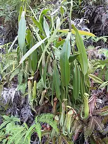 Nepenthes macrovulgaris (/nɪˈpɛnθz ˌmækrvʌlˈɡɛərɪs/; from Greek macro- "large" and Latin vulgaris "common, usual"), or the serpentine pitcher-plant,[4] is a tropical pitcher plant endemic to Borneo. It is a lowland plant that typically grows at altitudes ranging from 300 to 1200 m in sub-montane forest clearings and mossy forest. Its range is restricted to ultramafic habitats, including Mount Kinabalu, Mount Tambuyukon, the Danum Valley, the Tawai Range, the Meliau Range and Mount Silam, all in Sabah, Malaysian Borneo. Pitchers grow to around 25 cm high and range in colour from green to brown, with the speckled form being the most common.[5][6][7]