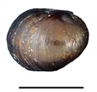 | Apertural view of a shell of Neritina iris. Scale bar is 10 mm. | |