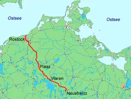 The Neustrelitz–Warnemünde Railway (German: Neustrelitz-Warnemünder Eisenbahn) is a railway line in the North German state of Mecklenburg-Vorpommern. Most of the line is a double-tracked, electrified main line and runs for almost 130 kilometres from Neustrelitz to Warnemünde. It is also known in German as the Lloydbahn (Lloyd Railway), referring to the Deutsch-Nordischer Lloyd company, which built the line and operated it in its early years after its opening in 1886.