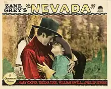 Nevada is a 1927 American silent Western film directed by John Waters and starring Gary Cooper, Thelma Todd, and William Powell.[1] Based on the novel Nevada by Zane Grey, the film is about a former outlaw hired to protect a ranch owner's daughter, which angers the ranch foreman who is in love with the girl. The villainous foreman spreads a rumor of his rival's dark past to the sheriff, and the former outlaw is soon on the run again. Eventually he captures a gang of cattle rustlers led by the foreman, and with his reputation restored, he marries the girl.[1] This lavish Western film was remade in 1944 as a B movie version titled Nevada starring Robert Mitchum—the only time Cooper and Mitchum played the same role; the remake was so early in Mitchum's career that he was billed with "Introducing Bob Mitchum as Jim Lacy."