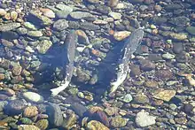 A 2016 study by independent environmental consulting group FishBio showed that the artificial spring pulse flows from New Melones Dam do fairly little to support salmon and steelhead out-migration in the Stanislaus River. Rather, the fish take their cues from increased water flow due to rainfall, as they naturally would have before the many dams on the Stanislaus River were built.[65] In the spring of 2016 about 12,500 juvenile salmon migrated downriver to the sea during April and May, but less than 1 percent migrated during the pulse flow. In years of drought when the lake level is low, releasing water during the spring creates consequences later in the year – because there is not enough cold water left for the autumn spawning run.[65]