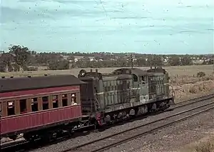 In 1950, the New South Wales Government Railways ordered 10 diesel locomotives from Australian General Electric.[1] The construction was sublet to British Thomson-Houston of Rugby in the United Kingdom with the body built by Metro Cammell, Birmingham.[2][3] The first entered service in December 1953 and the last in February 1955.[4] All were delivered painted in verdant green, in the 1960s all were repainted Indian red.