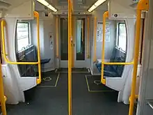 The design of the Hunter Railcars is derived from the Transwa Prospector and AvonLink - the major difference being the driving cars are each single-engined instead of dual-engined, due to the lower top speed requirement for the Hunter line. Reversible seating is covered with durable, vandal proof woollen moquette fabric in 3x2 formation, and have retractable footrests. CCTV is installed. The cars have been fitted with Dellner SP couplers. They are able to absorb the impact of a collision, and the anti-climbers will also reduce the force of impact. They also have a different body design. Instead of the entire body being of the same design, such as the Tangara, the driver's cab is built as a protective cage, made of fibreglass, which stretches to the end of the guard's door. The stainless steel paneling starts at the guard's door. The guard's door is designed to operate separately from the passenger doors.