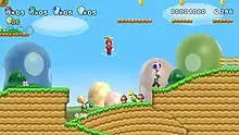 New Super Mario Bros. Wii is a 2.5D side-scrolling platformer; although it plays out in 2D, most of the in-game characters and objects are 3D polygonal renderings on 2D backgrounds.[7][8] In single-player mode, the player controls Mario and must complete various levels, which are filled with both helpful items and harmful obstacles. The player must maneuver him to a large flag pole at the end of each stage to progress.[9] The game can be played with the Wii Remote held horizontally, or vertically with the Wii Nunchuk attached.[10] Mario can run, jump, and perform additional moves returning from New Super Mario Bros. such as wall kicks, ground pounds and double and triple jumps.[11] New Super Mario Bros. Wii frequently makes use of the Wii Remote's motion control features; the player can shake the controller in order to perform various different actions, such as a short spin jump which kills enemies, a mid-air twirl that can be used to sustain air time, and the ability to pick up, carry and throw certain objects.[12][10][13] Certain areas within levels, such as specific platforms, can be manipulated by standing over them and tilting the Wii Remote.[12] Certain levels are set underwater, where the player must swim to traverse the level.[14]