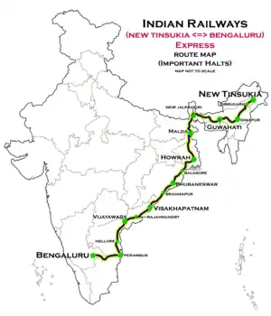 The 22501/02 New Tinsukia–SMVT Bengaluru Express is a weekly Superfast train which connects Tinsukia, the easternmost town of Assam with the South Indian Metropolis of Bengaluru. The train consists of AC 1st class, 2-tier, 3-tier and sleeper-class coaches. It is 6th longest train service of Indian Railways, as of 2023, which travels a total distance of 3542 kilometres.
