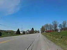 NY 98, meanwhile, proceeds toward the county line on Quaker Hill Road, which forms the first portion of the linear north–south alignment that the remainder of NY 98 takes to its northern terminus near Lake Ontario. About 0.5 miles (0.8 km) south of Orleans County, NY 98 passes through a marshy area and crosses over Oak Orchard Creek, here contained within a canal that takes the stream through the nearby swamps. The marshes follow NY 98 into Orleans County and the town of Barre, where the route meets County Route 99 (CR 99) at a junction 3 miles (5 km) north of the county line. Until the early 1950s, CR 99 (West Barre Road) was part of NY 279, which overlapped NY 98 between this point and its current southern terminus in the town of Gaines.[4][5] Past CR 99, Oak Orchard Road returns from its eastern sojourn and carries NY 98 as it heads across firmer areas through Barre Center and crosses into the town of Albion.