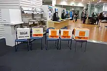 Election day always take place on a Saturday, so as to minimise the effect of work or religious commitments that could inhibit people from voting. Voting (the casting of ballots) happens at various polling stations, generally established in schools, church halls, sports clubs, or other such public places.[33] In some elections, polling booths are also set up in hospitals and rest homes for use by patients, but this did not happen in the 2020 election because of COVID-19.[34][35] Voters have the flexibility of voting any voting place in the country, regardless of the electorate they live in.[36] Some voting places may have electoral rolls of multiple electorates to assist voters, but if the voting place does not have the correct electoral roll then a voter will have to cast a special vote.[37]