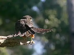 Ornithologists variously described the New Zealand falcon as an aberrant hobby or as allied to three South American species – F. deiroleucus (orange-breasted falcon), F. rufigularis (bat falcon), and F. femoralis (aplomado falcon); molecular phylogenetic studies show that it is most closely related to the aplomado falcon.[7] Two forms are apparent from their significantly different sizes, with the larger race in the South Island and the smaller in the North Island. Although neutral genetic markers show a recent history of these two forms, the substantial size difference is likely to be driven by ecological adaptation. Conservation management had already avoided mixing of the North Island (Falco novaeseelandiae ferox) and South Island (Falco novaeseelandiae novaeseelandiae) populations.[8]