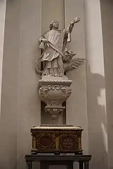 Quirinus’ relics were translated around 875 to the abbey church of Malmedy during the reign of Charles the Bald, and Malmedy became the centre of his cult.[3][4] Thus, he is sometimes venerated separately as St. Quirinus of Malmedy, and gained much more importance than his alleged companions Nicasius and Scubiculus. Quirinus' relics were officially confirmed as authentic by Abbot Poppo of Stavelot.[4] They are contained inside a wooden ossuary chest at the foot of a statue on the left of the nave.