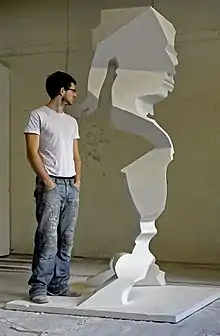 "Twofold" was commissioned by Harlow Art Trust. It is the 100th piece in Harlow's public sculpture collection[6] which includes works by Auguste Rodin, Barbara Hepworth, Henry Moore, and Elizabeth Frink, among many others, so is a fitting environment for an artist whose subject is frequently the canon and its construction. For this commission, Hornby has crossed one of the most canonic of figurative sculptures, Michelangelo's David, with a curving line from a 1925 Kandinsky drawing. In one rotation, David is visible; in another, it is Kandinsky's abstract line.
