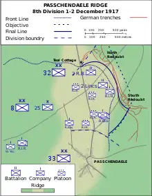After the First Battle of Passchendaele on 12 October, a new corps headquarters, Gruppe Staden took over the divisions between Gruppe Ypern to the south and Gruppe Dicksmuide further north, with its southern boundary from Vindictive Crossroads north-eastwards to Oostnieuwkerke, west of Westroosebeke. After the British attack on 10 November, both sides kept up continuous bombardments and night bombing by aircraft; the British flyers even attacked front line positions on moonlit nights. From November, the neighbouring divisions of Gruppe Staden and Gruppe Ypern held the area from Passchendaele village to a rise topped by Vat Cottage.[lower-alpha 3] The Gruppe Staden division occupied two positions known to the British as Southern Redoubt and Northern Redoubt, linked by Venison Trench, which was about 550 yd (500 m) long.[20] From 11 November, the 199th Reserve Division held the Gruppe Staden area until relieved the night of 16/17 November by the 4th Division, returning on the night of 21/22 November until the night of 30 November/1 December. In the Gruppe Ypern area, the 44th Reserve Division was in the line until 14 November and was relieved by the 25th Division until 20 November, then the division had another spell until 26 November, when the 25th Division took over again.[21]