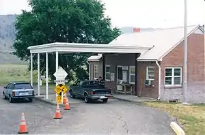 A customs office existed at Chopaka during the summer of 1861, before relocating to Osoyoos.[2] The next office opened in 1907 for railway traffic but relocated to the Keremeos preventative station the following year. That office closed in 1917 but reopened in 1940.[3] During the earlier years, a Keremeos officer would travel to Chopka to clear any livestock movements across the border.[4] The Similkameen office opened on the rail line a short distance north of the border in 1917 but closed in 1940.[2] In 1959, the Chopaka station was reopened at the road crossing, which is about 4 kilometres (2 mi) east of the rail crossing.[5] This road crossing existed by at least the early 1930s.[6]