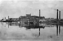 The settlement grew up in the seventeenth and eighteenth century around the church of St Nicholas. The location was transformed when Savva Vasilyevich Morozov bought land here in 1797. After he had bought his freedom in 1820, he moved his business from his nearby native village of Zuevo. In the period 1837-1838 he established a new factory on wasteland.[1] By 1859 it had a registered population of 2,489 people. This rose to 25,203 in 1897.[2] The Morozov property in Nikolskoye was split between Vikul Eliseevich Morozov and his uncle Timofei Savvich Morozov which sat side by side each other on the banks of the Klyazma River.