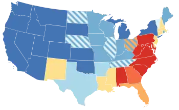 By August 2, 1919, 14 states had approved ratification. By the end of 1919, 22 had ratified the amendment.[53] In other states support proved more difficult to secure. Much of the opposition to the amendment came from Southern Democrats; only two former Confederate states (Texas and Arkansas) and three border states voted for ratification,[42] with Kentucky and West Virginia not doing so until 1920. Alabama and Georgia were the first states to defeat ratification. The governor of Louisiana worked to organize 13 states to resist ratifying the amendment. The Maryland legislature refused to ratify the amendment and attempted to prevent other states from doing so. Carrie Catt began appealing to Western governors, encouraging them to act swiftly. By the end of 1919, a total of 22 states had ratified the amendment.[53]