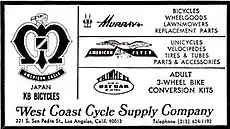 West Coast Cycle was founded by Leo Cohen Sr. and RosaBelle Cohen[2][3] who had previously been partners in Wheel Goods Corporation in Minneapolis, later moving to Los Angeles in 1946 to purchase an existing retail bicycle store, Atlas Cycle, renaming it Playrite Bicycle Supply Co.. The Cohens subsequently founded a bicycle, parts and accessory distribution company in the late 1950s, naming it West Coast Cycle Supply Company. They operated the company — widely known as West Coast Cycle (or WCC) – with their daughter Louise and sons Leo Jr. and Howie (Howard Sherwin Cohen). Howie Cohen subsequently took over the business, followed by his brother.[1]