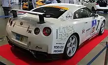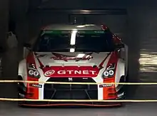 Nismo, the motorsport division of Nissan, participated with the GT-R Nismo GT500 in the Super GT series for the first time in 2008, replacing the 350Z GT.[5] The GT500 version of the car featured a completely different drivetrain compared to the production car. It featured the VK45DE 4.5-litre naturally aspirated V8 engine, replacing the VR38DETT engine.[6] It used a 6-speed sequential manual gearbox and a rear-wheel-drive layout derived from its predecessor.[7] A prototype was spotted testing around the Suzuka Circuit, as well as at the Fuji Speedway in Japan.[8][9] It went onto win the opening round of its debut season, at Suzuka scoring a 1–2 finish for Nissan.[10] In the following race, repeated its 1–2 result, won the drivers' championship in its debut season, through team Xanavi, and drivers Satoshi Motoyama and Benoît Tréluyer, although they only managed to finish third in the teams' championship. The car's dominant debut season saw it winning 7 out of 9 races and 10 podium finishes with four different teams.[11]
