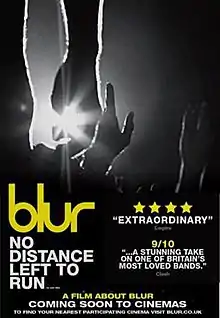 No Distance Left to Run is a documentary film about the British rock band Blur, released in cinemas on 19 January 2010. Following the band during their 2009 reunion and tour, the film also includes unseen archive footage and interviews. It was released on DVD on 15 February 2010 region free and the recording of the 2009 Hyde Park concert is included on a second disc.[1] It aired on BBC2 on 14 March 2010. It is the band's second documentary video, following Starshaped seventeen years before in 1993.
