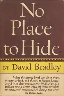 No Place to Hide is a 1948 book by American writer David J. Bradley published by Little, Brown and Company. The book is a Harvard Medical School graduate's autobiographical tale of his work in the Radiological Safety Section in the Pacific in the aftermath of the Bikini atomic bomb tests, Operation Crossroads. The book alerted the world to the dangers of radioactive fallout from nuclear weapon explosions.[1][2] The book was marketed for Bantam by Judith Merril, who found Bradley's prose "a man's book with little appeal for women", leading her to later write her own nuclear war story Shadow on the Hearth from the homemaker's perspective.[3] Bradley toured lecturing on the dangers of fallout, including a 1950 lecture at Ford Hall Forum.