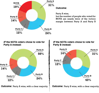 - ECI has stated that "...even if, in any extreme case, the number of votes against NOTA is more than the number of votes secured by the candidates, the candidate who secures the largest number of votes among the contesting candidates shall be declared to be elected..."[6][7]