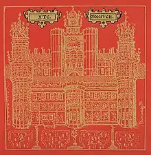 The album cover features an illustration of the palace, taken from a 1611 map of Surrey by John Speed.[7] Deborah A. Levinson of The Tech felt that the "certain formal elegance" of the Nonsuch Palace illustration and the typeface used in the packaging—a variation of Caslon, albeit with wobbly, uneven letters intended to appear like handwriting—displays a "gracefulness that nulls the listener, making Nonsuch sound harmless, when in fact it's XTC's most political album."[26] Each song on the album has its own illustration on the back cover. Partridge explained: "[T]hey call them chapbook drawings, they're supposed to educate children, you know, you gave a pic then you have a word underneath it, and the child is supposed to look at the drawing and copy the word and all that sort of stuff."[44]