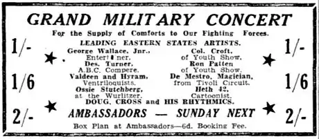He served with the First Australian Army Entertainment Unit during World War II,[12][13] in Dutch New Guinea, New Guinea, New Britain, and the Torres Strait Islands.[14][15] The Entertainment Unit also included actor Michael Pate, and comedian George Wallace Jr.