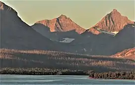 Norris Mountain (8,887 feet (2,709 m)) is located in the Lewis Range, Glacier National Park in the U.S. state of Montana.[1][4] Norris Mountain is situated along the Continental Divide; it is the parent of Triple Divide Peak—the point at which North America's Arctic, Atlantic, and Pacific drainage basins converge—located 0.8 miles (1.3 km) east-southeast.
