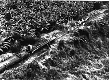 Shortly after World War II ended, however, the First Indochina War began, and the Viet Minh's sabotage of the rail system continued, this time against the armies of the French Union.[5] In response, the French began using the armed armoured train La Rafale as both a cargo-carrier and a mobile surveillance unit.[16][17] In February 1951 the first Rafale was in service on the Saigon-Nha Trang section of the North–South line.[18][19] Use of the Rafale failed to deter the Viet Minh guerrillas, however, who continued sabotaging the line, making off with its rails under cover of night and creating a 300 km (190 mi) rail network between Ninh Hoa and Da Nang, in a Viet Minh-controlled area.[5] In 1953, the guerrillas attacked La Rafale itself, mining and destroying stone bridges as they passed by.[20] In 1954, following the signature of Geneva Accords, Vietnam was temporarily divided into two parts: the communist North and anti-communist South. The North–South railway was bisected accordingly at Hiền Lương Bridge, a bridge over the Bến Hải River in Quảng Trị Province.[2]
