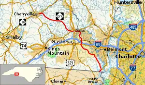 North Carolina Highway 277 (NC 277) was established in 1931 as a new primary routing; it connected U.S. Route 74 (US 74)/NC 20, in Gastonia to NC 150 in Cherryville. In 1936, its southern terminus was truncated at NC 275 in Dallas. In 1938, its western terminus was moved through downtown Cherryville to NC 274; it is unknown when it was overlapped with NC 274 to end at Church and Mountain streets. Between 1954 and 1957, the alignment along the route was straightened, creating several small loop roads along the route, several of which say "Old NC 277". In 1979, NC 277 was renumbered to NC 279, to accommodate for Interstate 277.[2]