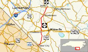 North Carolina Highway 410 (NC 410) is a primary state highway in the U.S. state of North Carolina. It serves as the central north–south highway in Columbus and Bladen Counties.