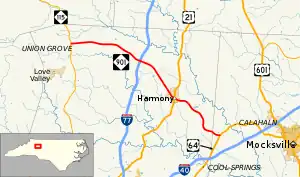 North Carolina Highway 901 (NC 901) is a primary state highway in the U.S. state of North Carolina. The highway serves to connect the town of Harmony with nearby major highways.