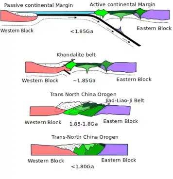In the Paleoproterozoic time (2.5–1.6 billion years ago), the North China Craton amalgamated in three steps, with the final amalgamation took place 1.85 billion years ago.[5][9] Based on the metamorphic ages in the Trans North China Orogen, the assembly and the formation process of the North China Craton is determined.[5][9] Zhao proposed that the North China Craton was formed from 4 blocks, the Yinshan Block, the Ordos Block, the Longgang Block and the Langrim Block.[5][9] The Yinshan and Ordos Blocks collided and formed the Western Block, creating the Khondalite Belt 1.95 billion years ago.[5][9] For the Eastern Block, there was a rifting event in the Jiao-Liao-Ji Belt, which separated the Longgang Block and the Langrim Block with an ocean before the block was formed 2.1 to 1.9 billion years ago.[5][9] A rifting system is proposed because of how the rocks were metamorphosed in the belt and symmetrical rocks have been found on both side of the Belt.[5][9] Around 1.9 billion years ago, the rift system at the Jiao-Liao-Ji Belt switched to a subductional and collisional system.[5][9] The Longgang Block and the Langrim Block then combined, forming the Eastern Block.[5][9] 1.85 billion years ago, the Trans North China Orogen was formed by the collision of the Eastern and Western Blocks in an eastward subduction system, with probably an ocean between the 2 blocks subducted.[2][5][9][14]