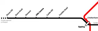 The latest version of the original proposal proposed to connect the North West Rail Link alignment to the Epping to Chatswood Rail Link via a tunnel between Epping and Franklin Road (now Cherrybrook) stations, whereas the earliest version of the original proposal had the route alignment connect with the existing Northern Line north of Cheltenham.[55] The direct route proposed using the stub tunnels originally built for the deferred Parramatta Rail Link between Parramatta and Epping.[55] New stub tunnels for the Parramatta Rail Link were to be constructed so that if the Epping to Parramatta line were completed, trains from Parramatta would have also been able to link into the Epping-Chatswood Line.[55]