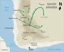 The Ramadan offensive began in February 1963 when Amer and Sadat arrived in San'a. Amer asked Cairo to double the 20,000 men in Yemen, and in early February the first 5,000 of the reinforcement arrived. On February 18 a task force of fifteen tanks, twenty armored cars, eighteen trucks and numerous jeeps took off from San'a' moving northwards, heading for Sadah. More garrison troops followed. A few days later another task force, spearheaded by 350 men in tanks and armored cars, struck out from Sadah southeastwards toward Marib. The maneuvered into the Rub al-Khali desert, perhaps well into Saudi territory, and there they were built up by an airlift. Then they headed westwards. On February 25 they occupied Marib and on March 7 they took Harib. A royalist force of 1,500 men ordered down from Najran failed to stop them on their way out from Sadah. The royalist commander at Harib fled to Beihan, on the British-protected side of the border.[45] In the battle of El Argoup, 25 miles (40 km) southeast of San'a, 500 royalists under Prince Abdullah's command attacked an Egyptian position on top of a sheer-sided hill that was fortified with six Soviet T-54 tanks, a dozen armored cars and entrenched machine guns. The royalists advanced in a thin skirmish line and were plastered by artillery, mortars and strafing planes. They replied with rifles, one mortar with 20 rounds, and a bazooka with four rounds. The battle lasted a week and cost the Egyptians three tanks, seven armored cars and 160 dead.[46] The Egyptians were now in positions from which they could hope to interdict the royalist movement of supplies in the mountains north and east of San'a'.[45]
