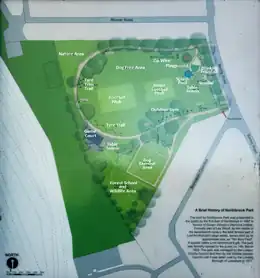 Northbrook Park is a public park in Grove Park,[1][2][3] currently managed by Glendale Grounds Management for the London Borough of Lewisham.[2] It is one of Lewisham's open spaces, and is open all year from 08:00 every morning, and closes near dusk, with times ranging from 16:00 to 21:00 in the evening, depending on time of year.[4] The park is roughly 9 acres (3.6 ha) in size, approximately 220 m (241 yd) wide east to west and around 260 m (284 yd) long north to south.[3] A large central field, around 4.5 acres (1.8 ha) in size takes up roughly half the park's total area, and is around 125 m (137 yd) north to south, 190 m (208 yd) east to west[3] and is flat ground with short grass and very few trees.[5] There is a straight concrete path joining the two gated entrances on Baring Road, and a long circular concrete path that surrounds the large central field.[1][3][5] A short metal fence built to keep dogs out, follows the path and surrounds the central field, which contains a football pitch, a second smaller junior football pitch, and outdoor gym equipment.[5] An old stone sundial erected in May 1903, with engraving describing the gift of the land by Lord Northbrook to commemorate Queen Victoria's Jubilee, stands at the front of the park off the straight path,[2][3] but it is in disrepair.[5] There is a small fenced playground with slides, swings, a zip line, a splash pool, a sandpit a roundabout and climbing frames in the northeast corner just inside the circular path,[5] it was constructed around 2000, and improved in 2012. There is a thin strip of woodland surrounding the central field, including oak trees, mostly outside of the path, with fewer trees inside the path.[3][5] The northwest corner is more overgrown and contains scrubland set aside as a wildlife area,[5] this is the site of the original children's playground.[3] South of the main field is an old bowling green,[1][3][6] that is now used as a dog exercise area.[5] South of this is a triangular piece of overgrown wooded ground with dirt paths cutting through it, this area used to be allotments and was not part of the original park grounds,[3] it is now set aside as a forest school area.[5] Just off the southwest corner of the central field there is a fenced multipurpose concrete game court,[5] where a pond was previously sited.[3][7]