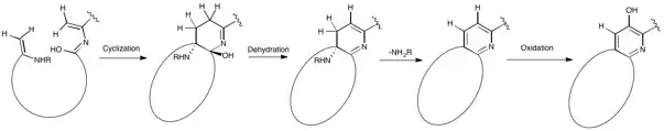All moieties of the peptidyl backbone of nosiheptide were shown to originate exclusively from proteinogenic amino acids. The structural motifs include dehydroamino acids from the serine or threonine residues undergoing anti elimination of water, thiazoles from cysteine residues with cyclodehydration followed by deoxygenation, and the central hydroxypyridine produced by cyclization between two dehydroalanine acids with incorporation of an adjacent carbonyl group.[2]